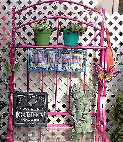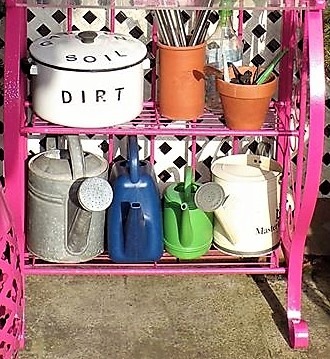 I wanted to give my Baker's Rack/Potting Stand a new coat of paint and since my neighbor Elly's house has been sold, I could no longer haul everything over to her back yard, which was all grass , to use as my spray painting place......